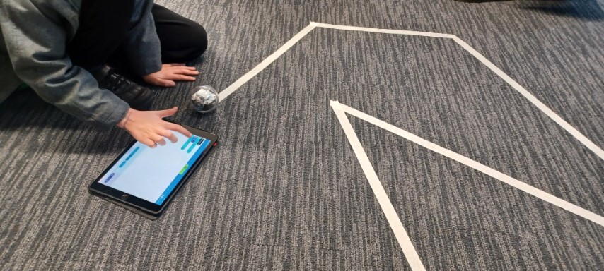 The club was hosted in a cozy room on the top floor of the library. Walking in, I expected rows of computers set up for traditional coding exercises. Instead, we found mysterious white lines taped onto the floor. Curious to find out what they were for, we soon learned they were meant to guide robots that the children would be programming. The instructor handed out iPads and small spherical robots known as Spheros, and the children were tasked with programming the robots to follow the lines.